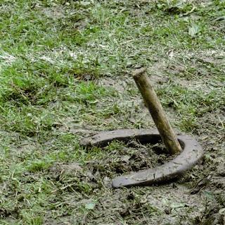 Hierbei muss ein Hufeisen aus ca. 7 Meter Entfernung so nah wie möglich an